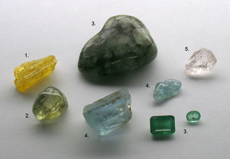 All beryls are made of the mineral beryllium aluminum silicate, and as pure beryl, they are colorless. But due to their structure, they are able to store different foreign chemicals, which turn colorless beryl green, yellow, pink, or blue.