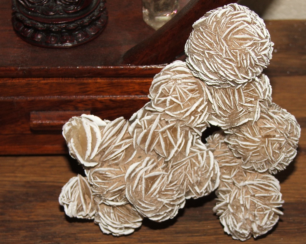 Selenite is a very soft mineral also known as alabaster and gypsum. In sandy areas, selenite sometimes forms a rosette pattern making a mineral formation called a Desert Rose.