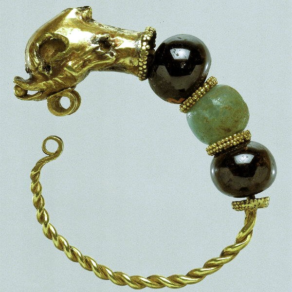 The earring pictured in the this photo is from about the 2nd century BC, from the island of Cyprus. It was made with twisted gold, garnet, aquamarine, and dolphin-head finials. The aquamarine and the dolphin symbolism made this earring a powerful charm of protection for sea travel.
